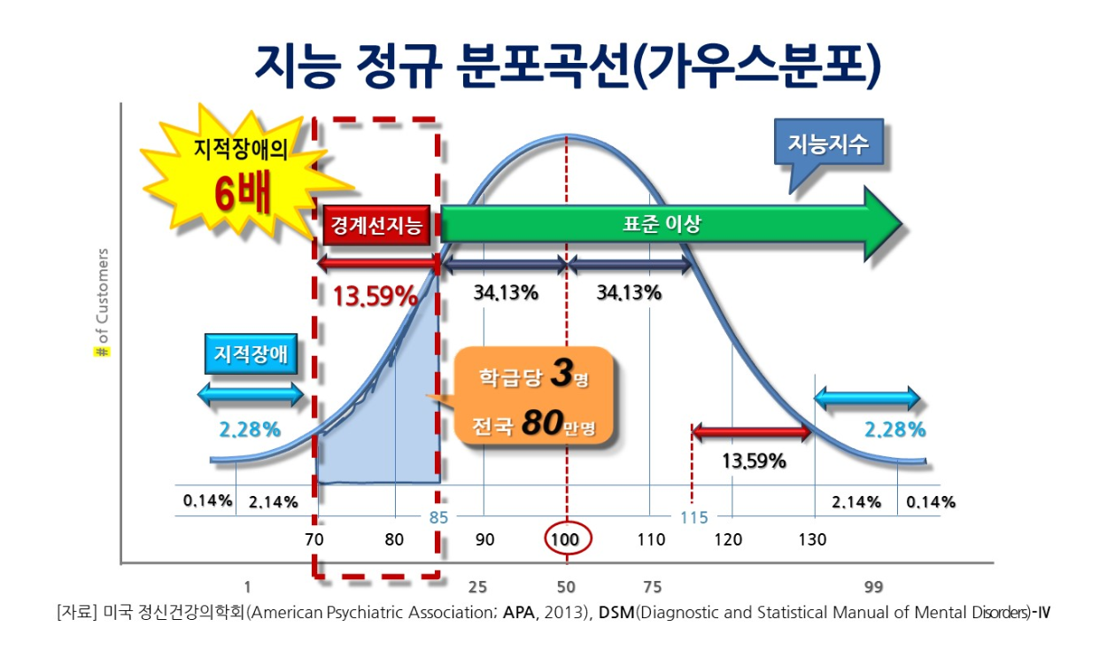 지난 해 우리나라 초등학생 4.6%가 경계선 지능 학생으로 파악되었습니다. 전체 인구로 보면 13.59%가 경계선 지능인이라는 조사결과도 있습니다.