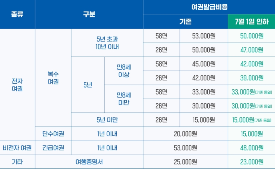 국제교류기여금이 인하로 여권발급 비용이 2024년 7월 1일부터3,000원 저렴해졌습니다.