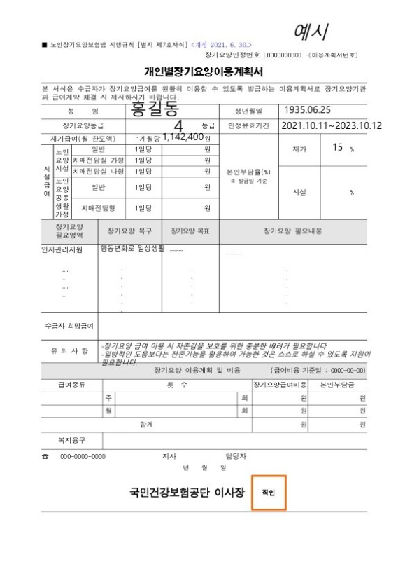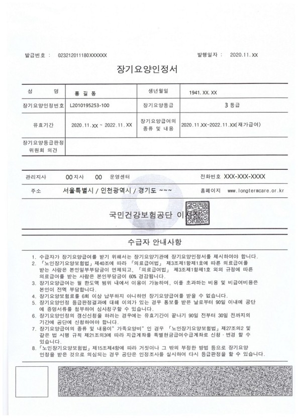등급이 결정되면, 보호자 집으로 공단에서 장기요양인정서와 개인별장기요양이용계획서를 우편으로 보낼 겁니다.