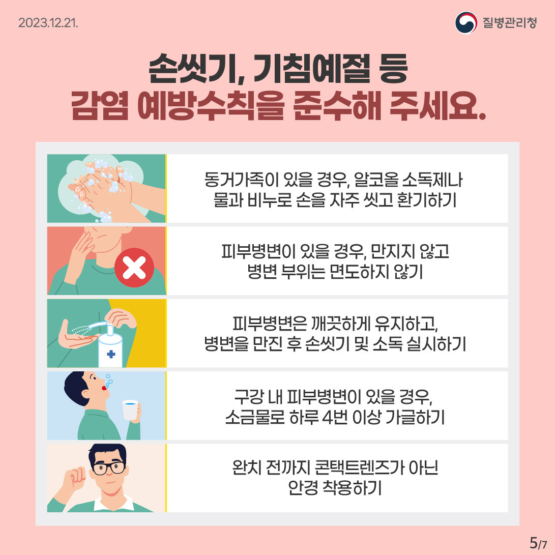 감염된 사람의 호흡기 분비물에 직접 접촉이나 감염 환자의 수포 등 환부를 만지면 감염될 수 있습니다.