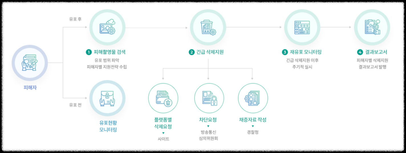 플랫폼별로 삭제를 요청하고, 요청이 받아들여지지 않으면 방송통신심의위원회로 차단을 요청합니다.