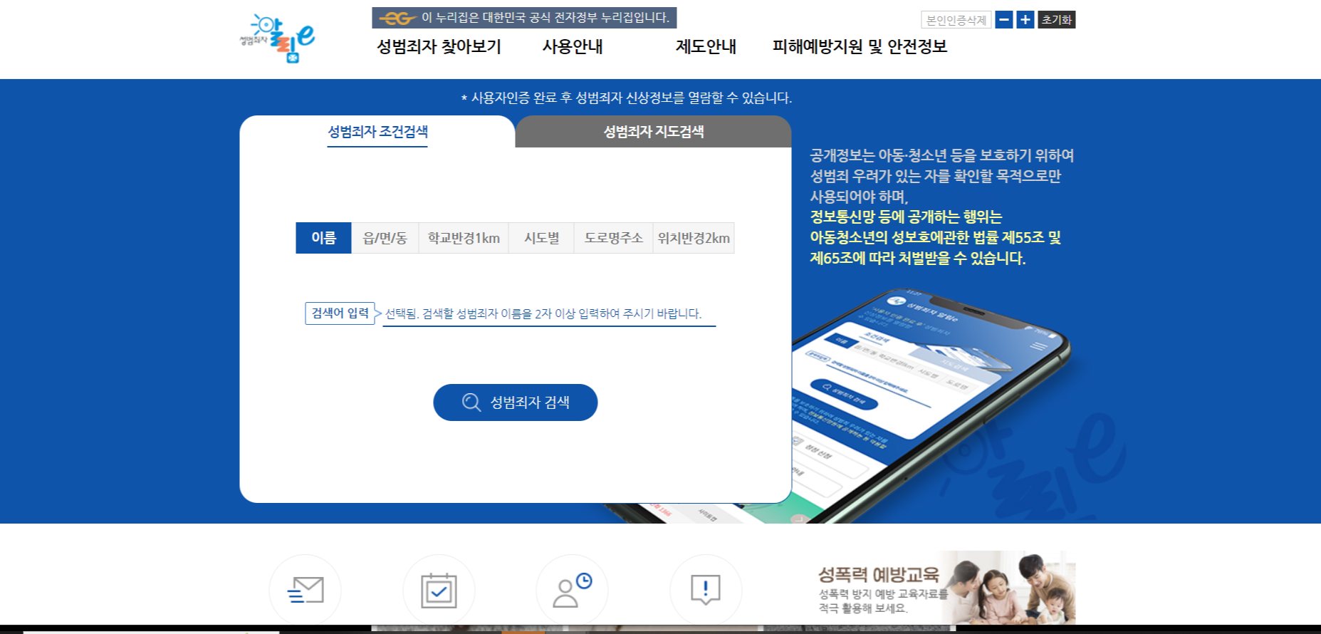 이름, 도로명주소, 교육기관(학교, 유치원, 어린이집 등) 반경 1km 등 다양한 조건으로 성범죄자를 검색하고 신상정보를 열람할 수 있습니다