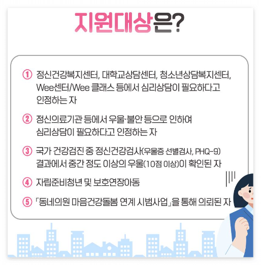 전국민 마음투자 지원사업은 우울과 불안 등의 정서적 어려움을 겪고 있어 심리 상담이 필요한 분들이 대상입니다