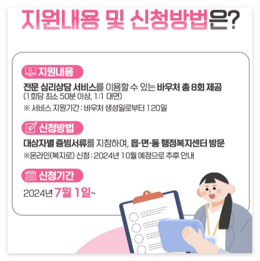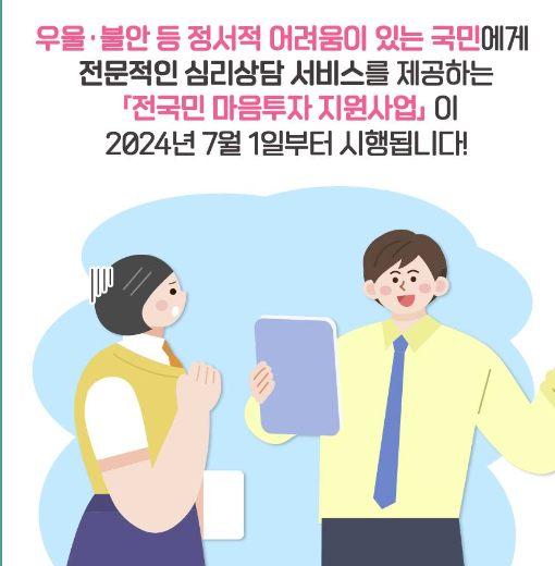2024년 7월 1일부터 정서적 어려움을 겪고 있는 모든 분들이 전문적인 심리상담 서비스를 받을 수 있도록 「전국민 마음투자 지원사업」을 시작합니다