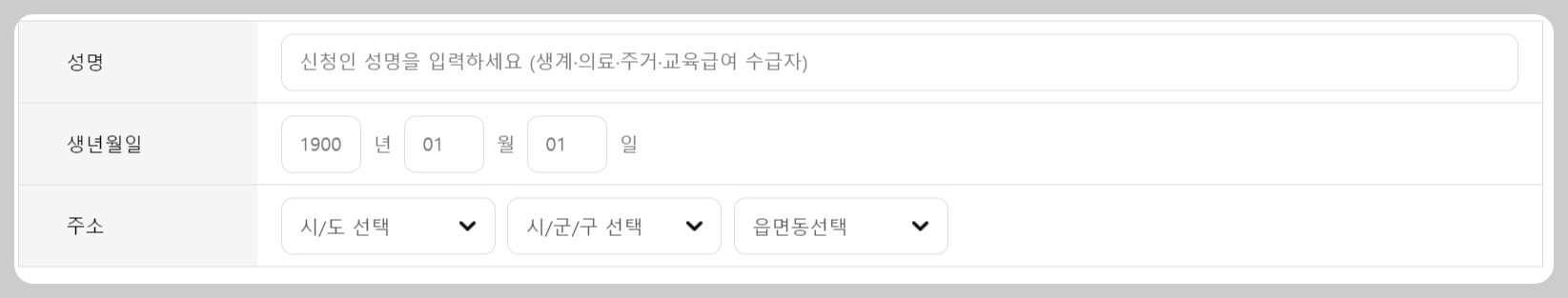 ▷ 주민등록상 수급자(본인) 또는 세대원이 다음에 해당하는 경우 신청할 수 있습니다.