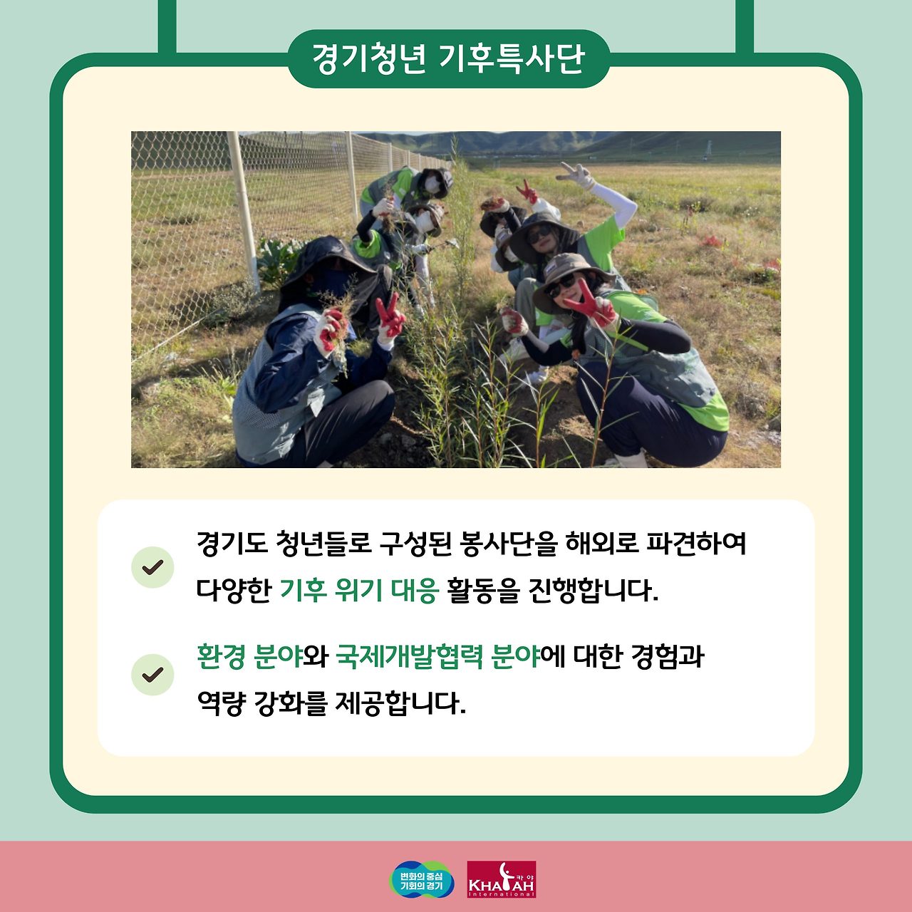 경기청년 기후특사단은 기후 변화 문제를 해결하기 위해 다양한 활동을 진행하는 단체로 기후 위기 대응에 관심이 있는 청년 여러분의 많은 참여를 바랍니다.
