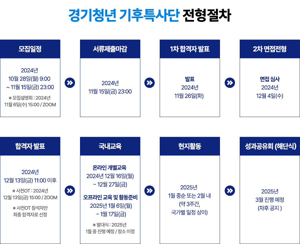 모집 기간은 2024년 10월 28일부터 11월 15일까지입니다. 이후 11월 26일에 최종 선발된 단원들이 발표됩니다. 선발된 단원들은 12월 16일부터 27일까지 온라인 교육을 받게 되며, 이후 다양한 활동이 예정되어 있습니다.