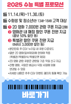 CGV에서는 2025 수능 특별 프로모션으로 11월 14일부터 30일까지 수험생 및 청소년들에게 특별 할인 혜택을 제공합니다.