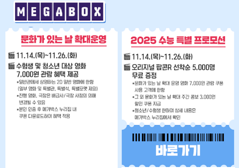 2025 수능을 준비한다고 고생했던 수험생 여러분, 영화관 할인 이벤트를 통해 즐거운 시간 보내시길 바랍니다.