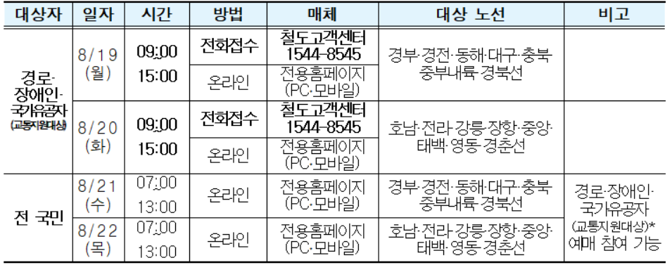 8월 21일~22일 경로·장애인·국가유공자(교통지원대상) 도 예매 참여 가능합니다.